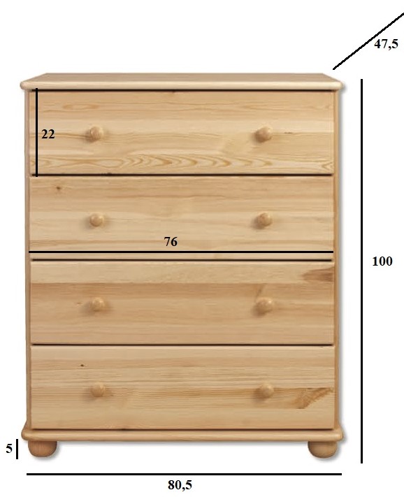 Nabízíme Vám kvalitní dřevěnou vyšší komodu disponující čtyřmi šuplíky. Půda a dno mají zakulacené hrany. Použitý materiál je kvalitní masivní dřevo z borovice. Díky svému minimalistickému designu se hodí téměř do každého interiéru, perfektně se bude vyjímat například v dětském pokoji, ložnici či třeba chodbě. U zásuvek jsou použity pevné kovové výsuvy.