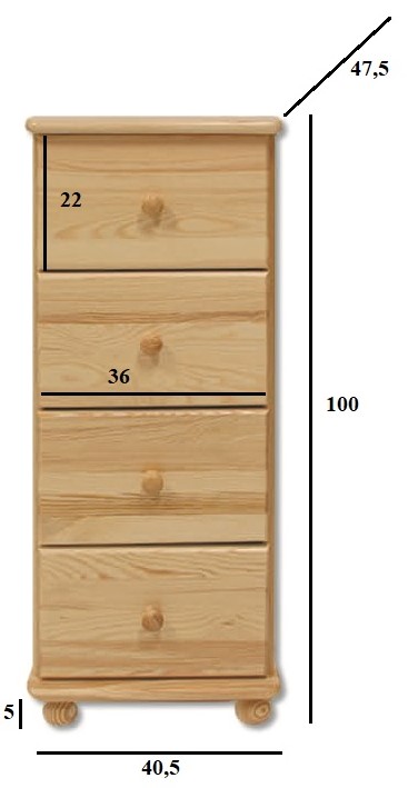 Nabízíme Vám kvalitní dřevěnou vyšší komodu disponující čtyřmi šuplíky. Půda a dno mají zakulacené hrany. Použitý materiál je kvalitní masivní dřevo z borovice. Díky svému minimalistickému designu se hodí téměř do každého interiéru, perfektně se bude vyjímat například v dětském pokoji, ložnici či třeba chodbě. U zásuvek jsou použity pevné kovové výsuvy.