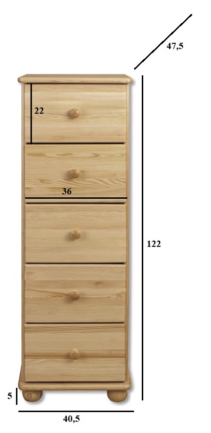 Nabízíme Vám kvalitní dřevěnou vysokou komodu disponující pěti šuplíky. Půda a dno mají zakulacené hrany. Použitý materiál je kvalitní masivní dřevo z borovice. Díky svému minimalistickému designu se hodí téměř do každého interiéru, perfektně se bude vyjímat například v dětském pokoji, ložnici či třeba chodbě. U zásuvek jsou použity pevné kovové výsuvy.