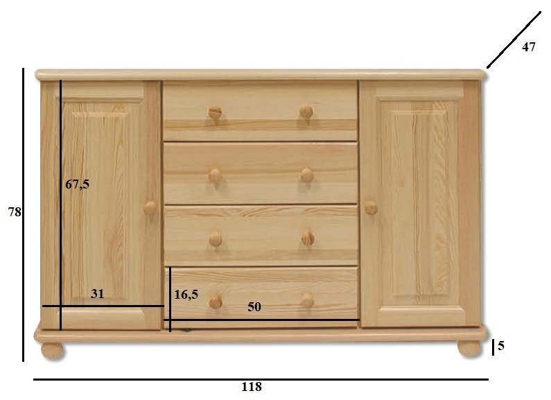 Nabízíme Vám kvalitní dřevěnou nižší komodu disponující čtyřmi šuplíky a dvěma skříňkami s dvířky. Za oběma dvířky se nachází úložný prostor a v každém z nich jedna police. Půda a dno mají zakulacené hrany. Použitý materiál je kvalitní masivní dřevo z borovice. Díky svému minimalistickému designu se hodí téměř do každého interiéru, perfektně se bude vyjímat například v dětském pokoji, ložnici či třeba chodbě. U zásuvek jsou použity pevné kovové výsuvy.