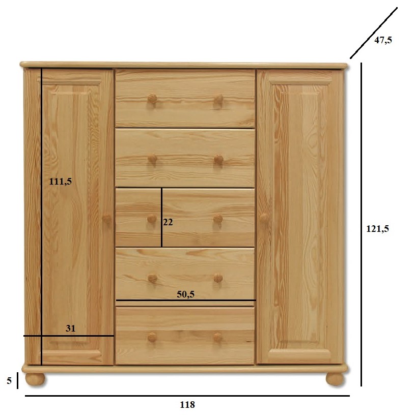 Nabízíme Vám kvalitní dřevěnou vysokou komodu disponující pěti šuplíky a dvěma skříňkami s dvířky. Za oběma dvířky se nachází úložný prostor a v každém z nich dvě police. Půda a dno mají zakulacené hrany. Použitý materiál je kvalitní masivní dřevo z borovice. Díky svému minimalistickému designu se hodí téměř do každého interiéru, perfektně se bude vyjímat například v dětském pokoji, ložnici či třeba chodbě. U zásuvek jsou použity pevné kovové výsuvy.