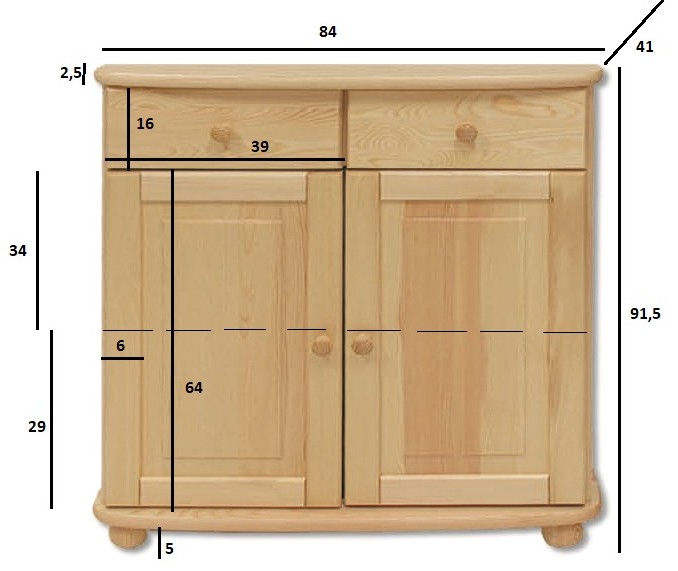 Nabízíme Vám kvalitní dřevěnou vyšší komodu disponující dvěma šuplíky a skříňkou s dvěma dvířky. V úložném prostoru za dvířkami se nachází jedna police. Půda a dno mají zakulacené hrany. Použitý materiál je kvalitní masivní dřevo z borovice. Díky svému minimalistickému designu se hodí téměř do každého interiéru, perfektně se bude vyjímat například v dětském pokoji, ložnici či třeba chodbě. U zásuvek jsou použity pevné kovové výsuvy.