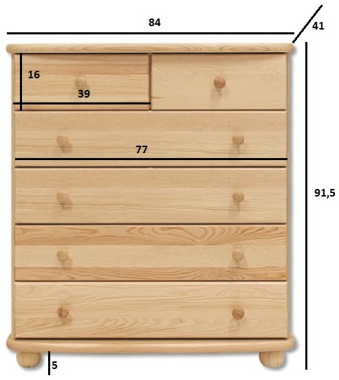 Nabízíme Vám kvalitní dřevěnou vyšší komodu disponující čtyřmi většími a dvěma menšími šuplíky. Půda a dno mají zakulacené hrany. Použitý materiál je kvalitní masivní dřevo z borovice. Díky svému minimalistickému designu se hodí téměř do každého interiéru, perfektně se bude vyjímat například v dětském pokoji, ložnici či třeba chodbě. U zásuvek jsou použity pevné kovové výsuvy.