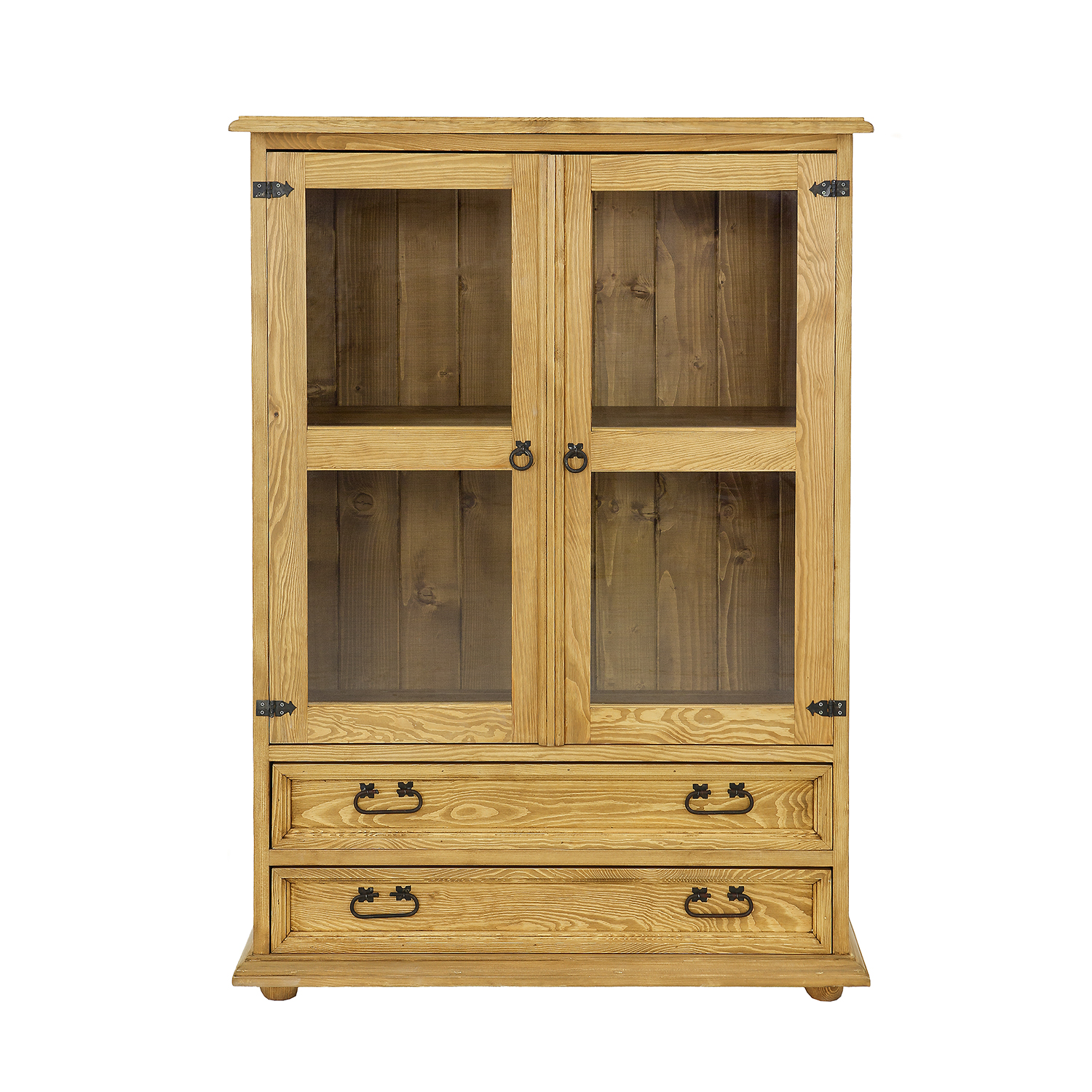 Nabízíme Vám kvalitní dřevěnou komodu disponující dvěma šuplíky s pevnými kovovými výsuvy a prosklenými dvířky. Charakteristická struktura přírodního dřeva a teplé barvy dodají každému interiéru jedinečnou atmosféru a příjemný naturální nádech.