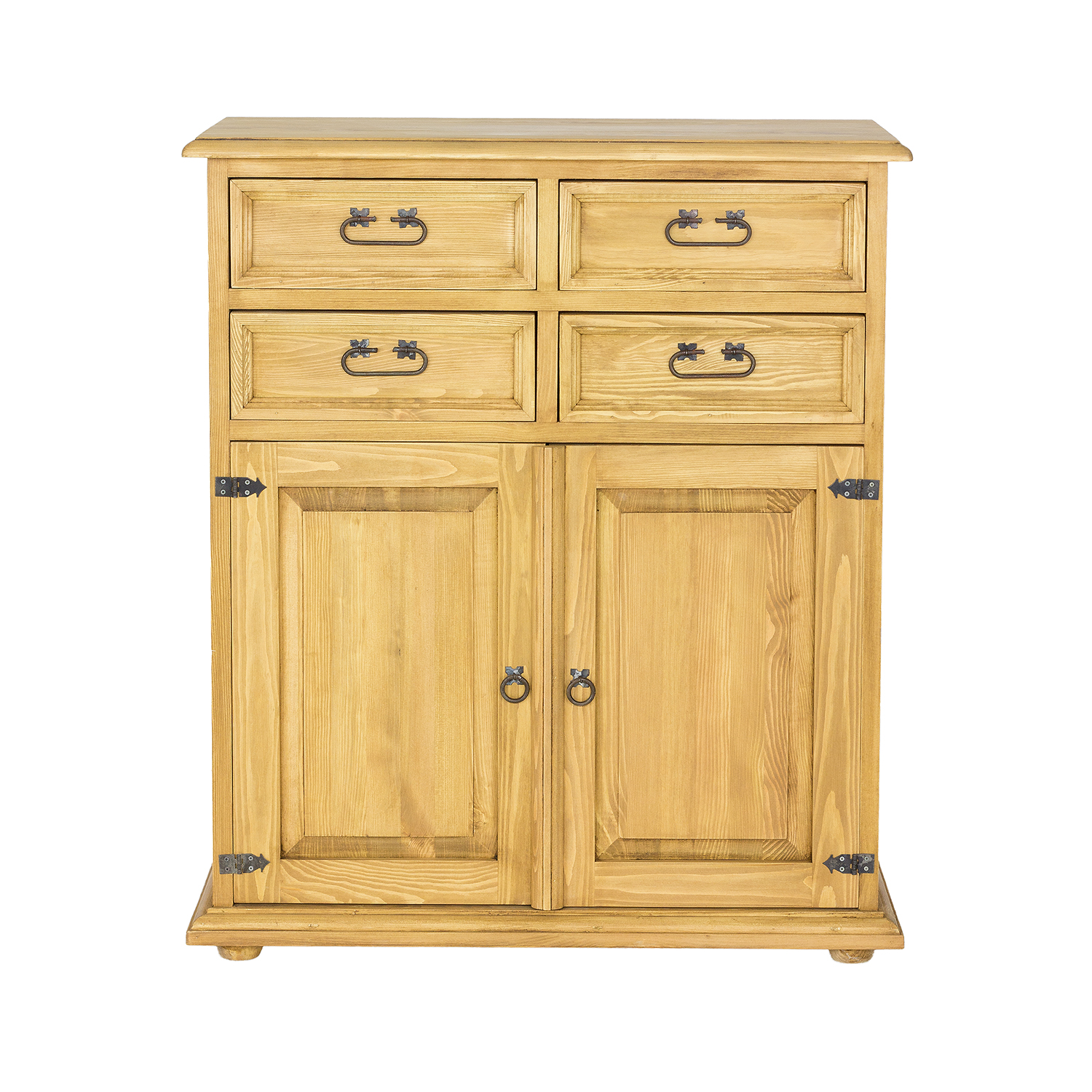 Nabízíme Vám kvalitní dřevěnou komodu disponující čtyřmi šuplíky s pevnými kovovými výsuvy a dvířky. Charakteristická struktura přírodního dřeva a teplé barvy dodají každému interiéru jedinečnou atmosféru a příjemný naturální nádech.