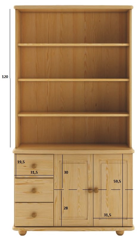 Nabízíme Vám kvalitní dřevěný kredenc zhotovený z masivu borovice nejvyšší jakosti. Tento kredenc s přirozenou kresbou borovicového dřeva se bude skvěle vyjímat ve vaší kuchyni či obývacím pokoji a perfektně poslouží k uložení domácích drobností a vystavení rodinných fotografií, památek nebo knih.