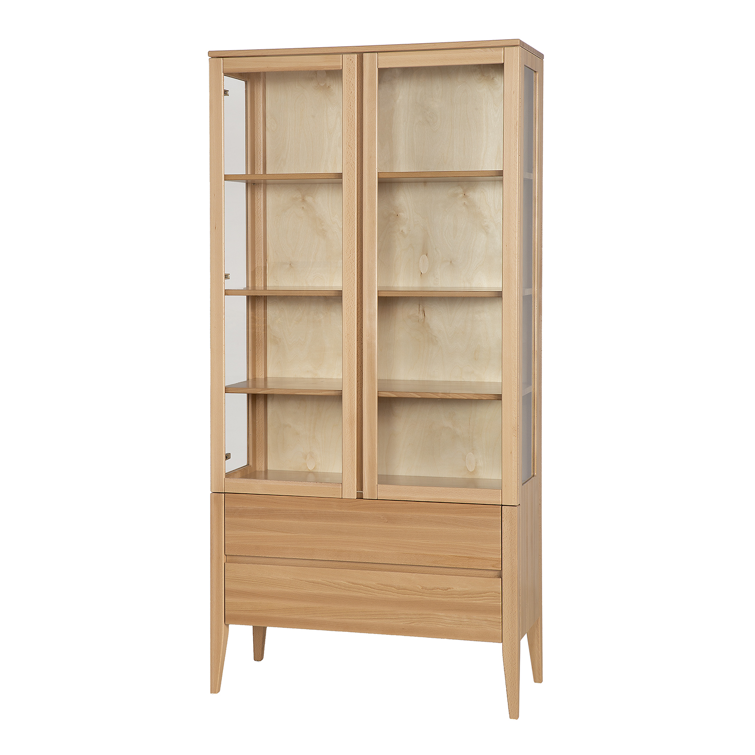 Tato vitrína disponuje dvěma úložnými šuplíky a skříňkou s prosklenými dvířky. Skříňka má tři police. Celodřevěné šuplíky jsou na skrytých značkových kovových ložiskových výsuvech dovolující 90% otevření. Šuplíky i dveře jsou osazeny tlumičem dovírání. U dveří jsou použity kvalitní kovové samozavírací panty, které umožňují úhel otevření až 110°.