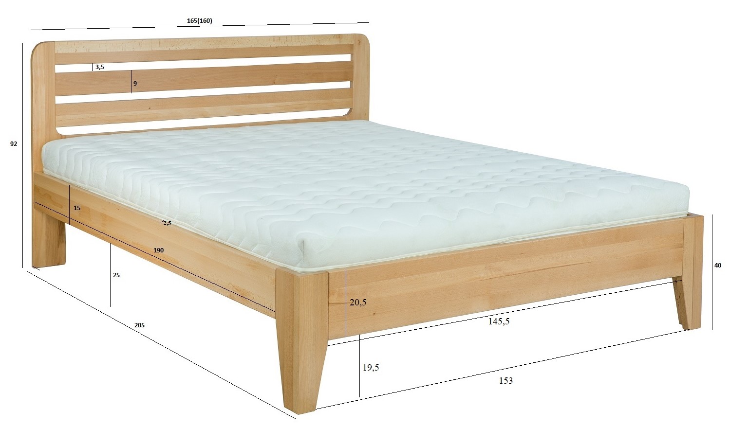 Nabízíme Vám kvalitní dřevěnou postel zhotovenou z masivu buku nejvyšší jakosti. Nadchne Vás nejen charakteristická struktura a viditelná kresba přírodního dřeva, ale také specifická přírodní vůně, která příjemně provoní Vaší domácnost, penzion či hotel. Potěší Vás svou dlouhou životností a v kombinaci s naší zdravotní matrací Vám poskytne dokonale pohodlný spánek.