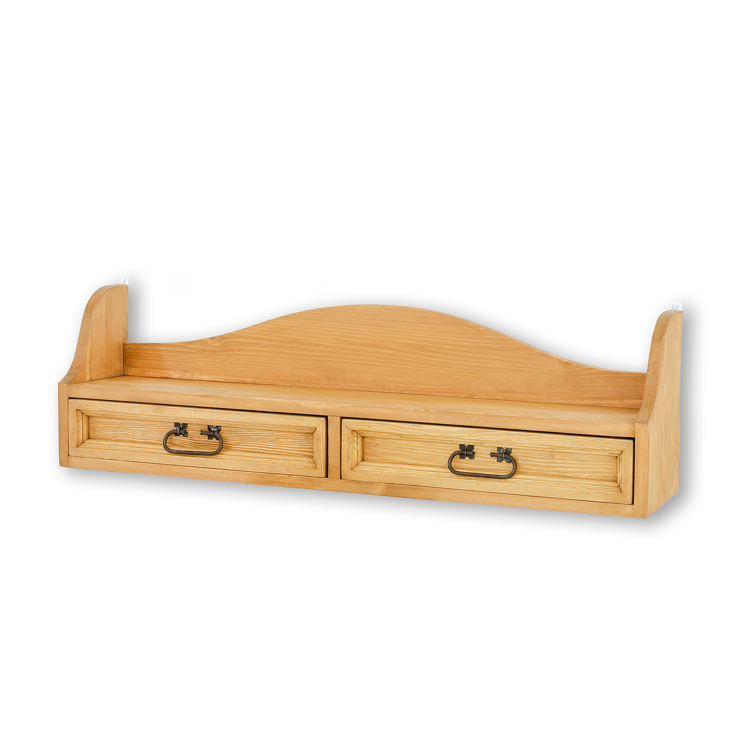 Tato závěsná kořenková police disponuje dvěma šuplíky a poličkou.