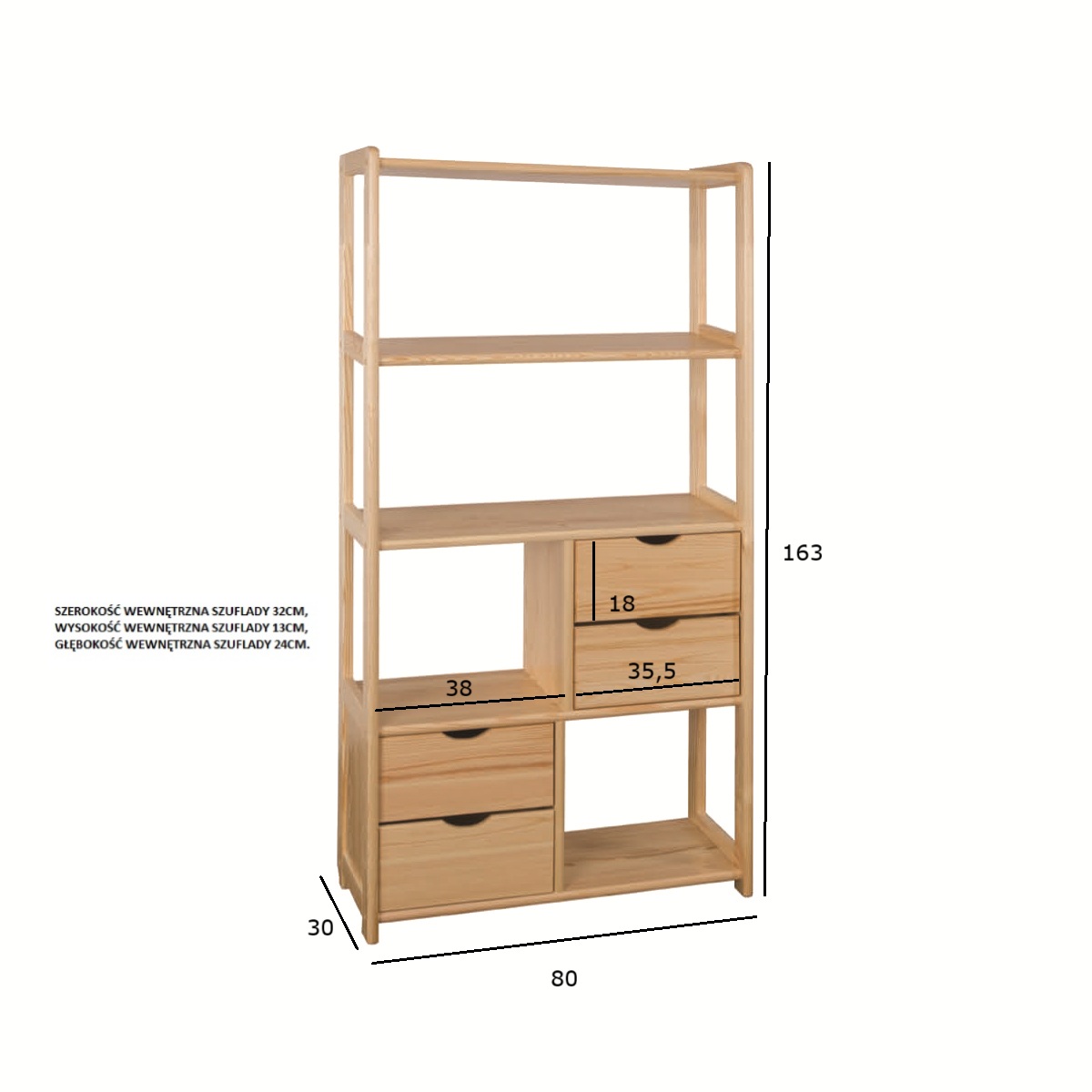 Nabízíme Vám kvalitní dřevěný regál zhotovený z masivu borovice nejvyšší jakosti. Díky svému minimalistickému designu se hodí téměř do každého interiéru. Perfektně zaujme ve vaší domácnosti, penzionu či hotelu. Využití najde ve vaší kuchyni, spíži, dětském i obývacím pokoji. Tento regál nabízí dostatek úložného prostoru a zároveň skvěle poslouží k vystavení rodinných fotografií, památek nebo knih.