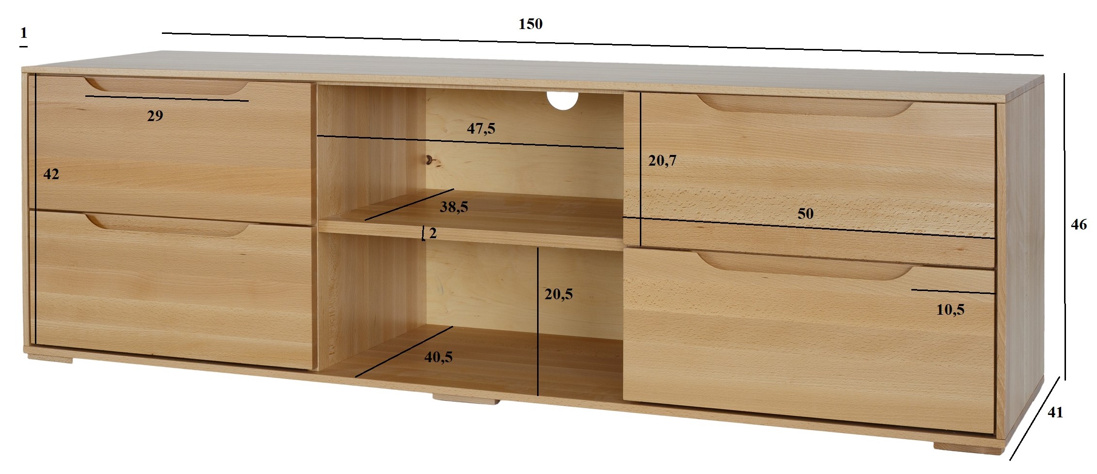Nabízíme Vám kvalitní dřevěný televizní stolek zhotovený z masivu buku nejvyšší jakosti. Nadchne Vás nejen charakteristická struktura a viditelná kresba přírodního dřeva, ale také specifická přírodní vůně, která příjemně provoní Vaší domácnost.
