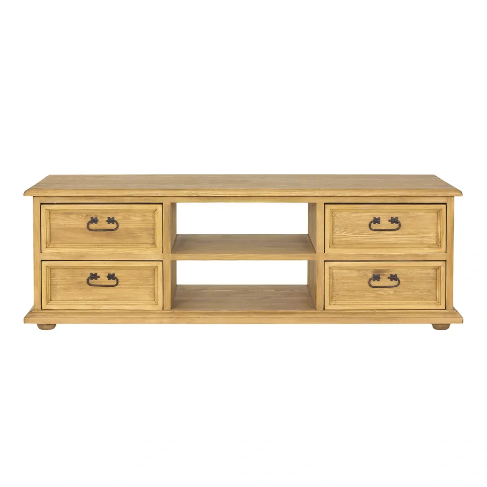 Nabízíme Vám kvalitní dřevěný televizní stolek vyrobený z masivu borovice v rustikálním stylu s kovanými panty a rukojeťmi. Charakteristická struktura přírodního dřeva a teplé barvy dodají každému interiéru jedinečnou atmosféru a příjemný naturální nádech.