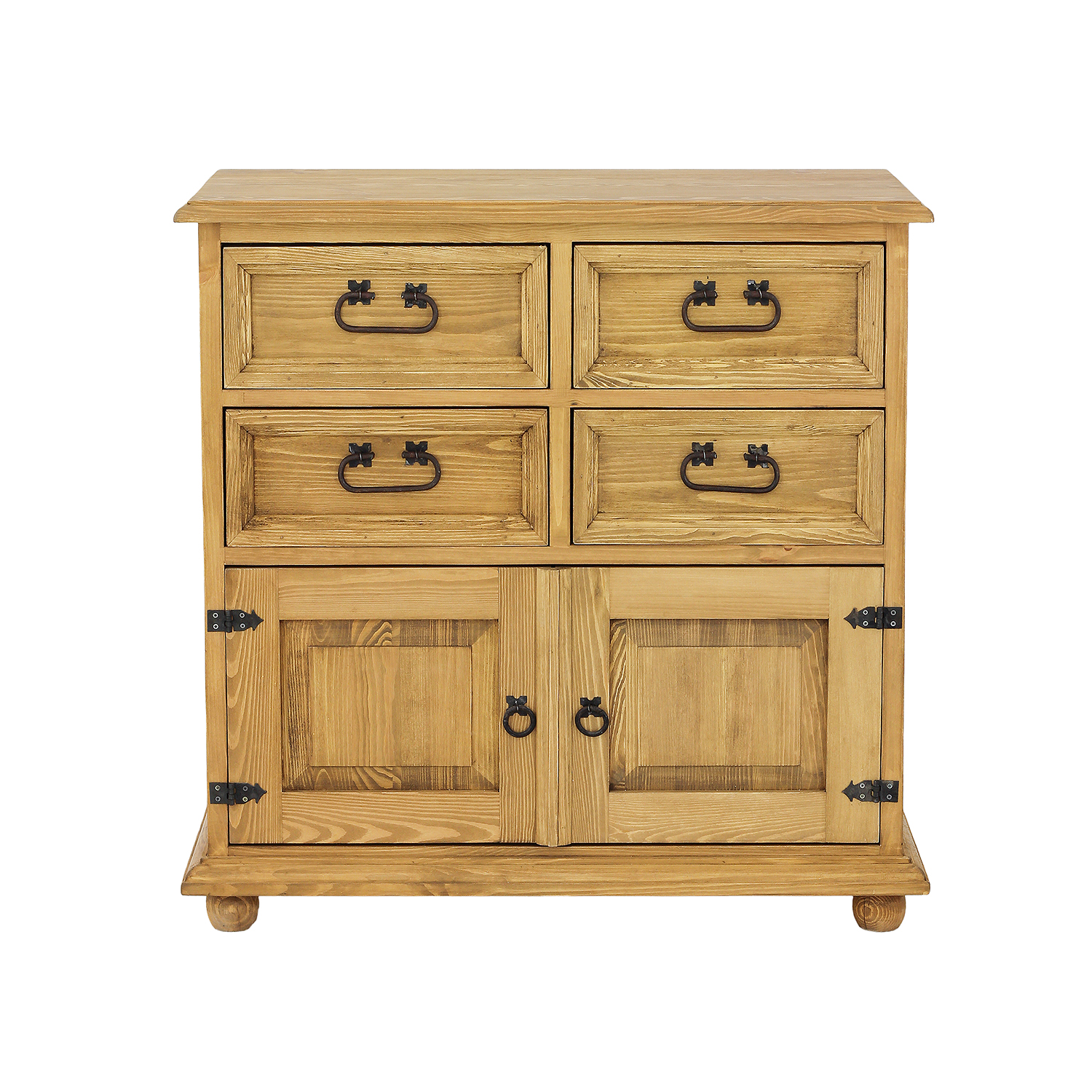 Nabízíme Vám kvalitní dřevěnou komodu disponující čtyřmi šuplíky s pevnými kovovými výsuvy a dvěma dvířky. Charakteristická struktura přírodního dřeva a teplé barvy dodají každému interiéru jedinečnou atmosféru a příjemný naturální nádech.
