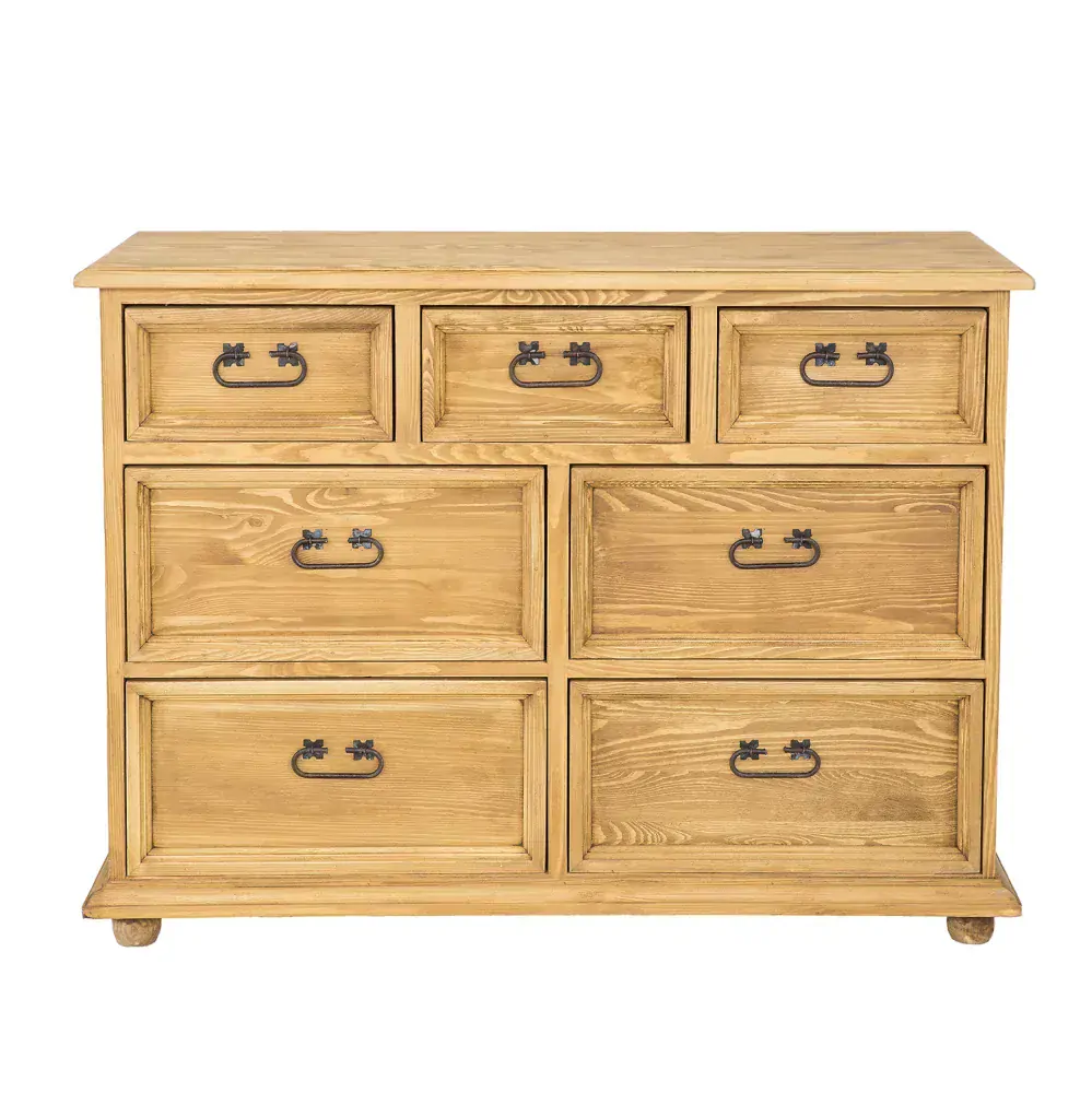 Nabízíme Vám kvalitní dřevěnou komodu disponující čtyřmi velkými a třemi menšími šuplíky s pevnými kovovými výsuvy. Charakteristická struktura přírodního dřeva a teplé barvy dodají každému interiéru jedinečnou atmosféru a příjemný naturální nádech.