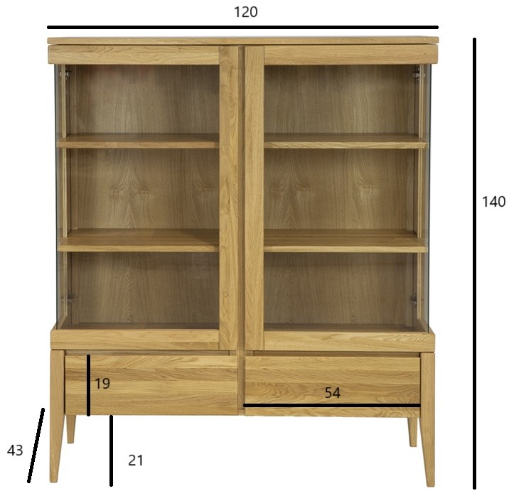 Vitrína disponuje dvěma úložnými šuplíky a skříňkou s prosklenými dvířky. Skříňka má dvě police. Retro styl dubové vitríny KW336 podtrhují vysoké nohy, které dodávají nábytku eleganci a lehkost.
