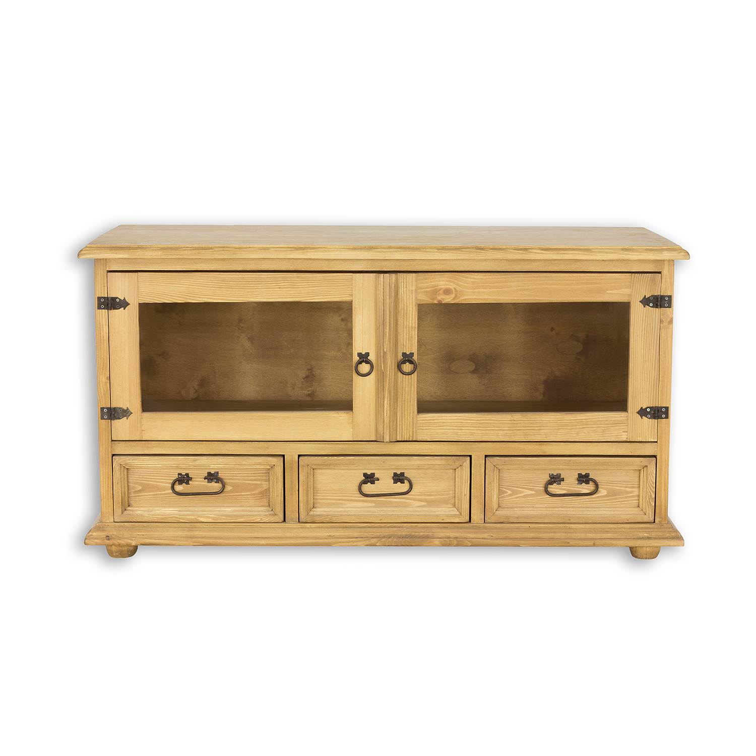 Nabízíme Vám kvalitní dřevěný televizní stolek vyrobený z masivu borovice v rustikálním stylu s kovanými panty a rukojeťmi. Charakteristická struktura přírodního dřeva a teplé barvy dodají každému interiéru jedinečnou atmosféru a příjemný naturální nádech.